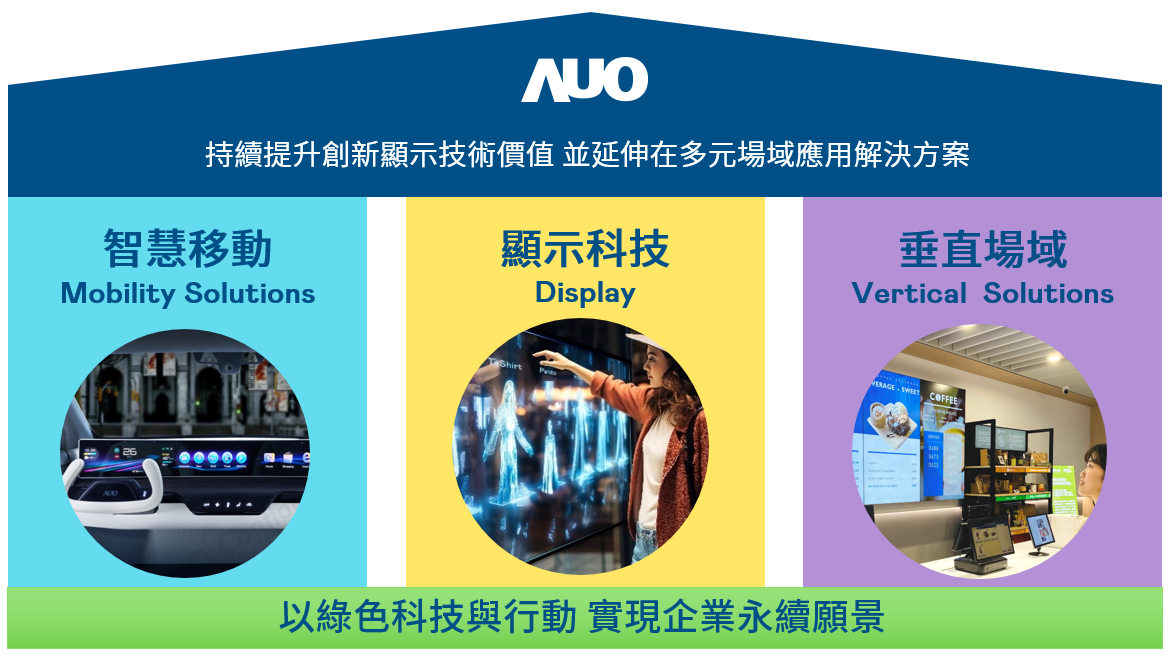 我們持續推動「雙軸轉型」,在精進顯示技術附加價值(Go Premium),與深化垂直市場應用(Go Vertical)的策略下,對應Ag尊龙凯时的優勢競爭力與趨勢,我們奠定顯示技術智慧移動垂直場域三大永續營運支柱,在顯示技術領域的根基之上,延伸布局多元場域應用解決方案。將先進顯示科技助力智慧移動及垂直場域發展,並以綠色科技與行動為實踐,在轉型之路上貫徹永續經營之願景。
